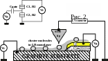 а графитовую подложку с нанесенной на ней пленкой Ленгмюра-Блоджетт (мономолекулярный слой) осаждались кластерные молекулы. Управляющее напряжение подается на золотой контакт 2 - затвор (истоком в данной схеме служит графитовая подложка, стоком игла сканирующего микроскопа). Сканирующий туннельный микроскоп находит молекулу и снимает в этой точке вольт-амперную характеристику – зависимость туннельного тока от напряжения на затворе (рис.3). Ступеньки на характеристике соответствуют скачкам проводимости, так называемой «кулоновской лестнице» (скачкообразном изменении силы тока увеличении напряжения до значения достаточного для заброски на островок очередного электрона).