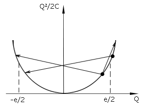 где — квантовое сопротивление. Одно из важнейших предположений теории одноэлектронного туннелирования заключалось в том, что начальный заряд , на туннельном переходе может быть отличен от нуля, и, более того, может принимать значения, не кратные целому числу электронов. Данный факт объясняется тем, что начальный заряд может создаваться поляризацией близлежащих электродов, заряженных примесей и т.д. и, таким образом, иметь любое значение. Тогда заряд Q в уравнении (1) будет иметь вид . Из всего вышесказанного вытекает, что, если Q лежит в пределах от до , добавление или вычитание целого числа электронов будет увеличивать энергию (1), т.е. является энергетически невыгодным. Данный вывод иллюстрируется на рис. 1.