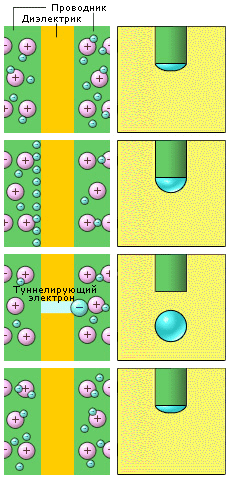 Процесс протекания тока через одиночный туннельный переход происходит в несколько стадий. Так как ток является величиной непрерывной, то заряд на одной стороне перехода накапливается постепенно. При достижении величины е/2 происходит туннелирование одного электрона через переход и процесс повторяется. Здесь можно провести аналогию с каплей воды, отрывающейся от края трубки, предложенную К. К. Лихаревым: при достижении некоторой критической массы капля отрывается от крана и начинается образование следующей. На рис. 2 представлен процесс одноэлектронного туннелирования в условиях кулоновской блокады.