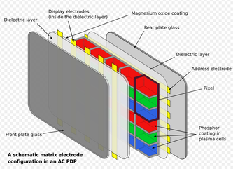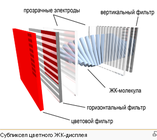 | 50. Газоразрядный экран (плазменная панель) — устройство отображения информации, использующее в своей работе явления электрического разряда в газе и возбуждаемого им свечения люминофора. Плазменная панель представляет собой матрицу газонаполненных ячеек, заключенных между двумя параллельными стеклянными поверхностями. В качестве газовой среды обычно используется неон или ксенон. Разряд в газе протекает между прозрачным электродом на лицевой стороне экрана и адресными электродами, проходящими по его задней стороне. Газовый разряд вызывает ультрафиолетовое излучение, которое, в свою очередь, инициирует видимое свечение люминофора. В цветных плазменных панелях каждый пиксель экрана состоит из трёх идентичных микроскопических полостей, содержащих инертный газ (ксенон) и имеющих два электрода, спереди и сзади. После того, как к электродам будет приложено сильное напряжение, плазма начнёт перемещаться. При этом она излучает ультрафиолетовый свет, который попадает на люминофоры в нижней части каждой полости. Люминофоры излучают один из основных цветов: красный, зелёный или синий. Затем цветной свет проходит через стекло и попадает в глаз зрителя. | 51. Жидкокристаллический индикатор предназначен для отображения графической информации с компьютера, TV-приёмника, цифрового фотоаппарата, электронного переводчика, калькулятора и пр. Каждый пиксел ЖК-дисплея состоит из слоя молекул между двумя прозрачными электродами, и двух поляризационных фильтров, плоскости поляризации которых (как правило) перпендикулярны. В отсутствие жидких кристаллов свет, пропускаемый первым фильтром, практически полностью блокируется вторым. Поверхность электродов, контактирующая с жидкими кристаллами, специально обработана для изначальной ориентации молекул в одном направлении. В TN-матрице эти направления взаимно перпендикулярны, поэтому молекулы в отсутствие напряжения выстраиваются в винтовую структуру. Эта структура преломляет свет таким образом, что до второго фильтра плоскость его поляризации поворачивается, и через него свет проходит уже без потерь. Если не считать поглощения первым фильтром половины неполяризованного света — ячейку можно считать прозрачной. Если же к электродам приложено напряжение — молекулы стремятся выстроиться в направлении поля, что искажает винтовую структуру. При этом силы упругости противодействуют этому, и при отключении напряжения молекулы возвращаются в исходное положение. При достаточной величине поля практически все молекулы становятся параллельны, что приводит к непрозрачности структуры. Варьируя напряжение, можно управлять степенью прозрачности. Важнейшие характеристики ЖК-мониторов: разрешение, размер точки, соотношение сторон экрана, видимая диагональ, контрастность, яркость, время отклика, угол обзора, тип матрицы. |