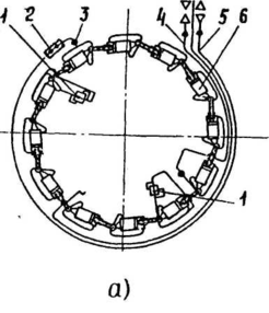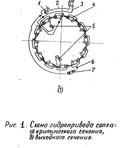 Гидропривод критического сечения сопла включает в себя двенадцать гидроцилиндров 6 (рис. 1 а), охватывающих систему малых створок в виде браслета, два клапана постоянного расхода 1, два гидрошарнира 3, два блока гидрошарниров 2. Рабочий коллектор 4 и коллектор слива 5.