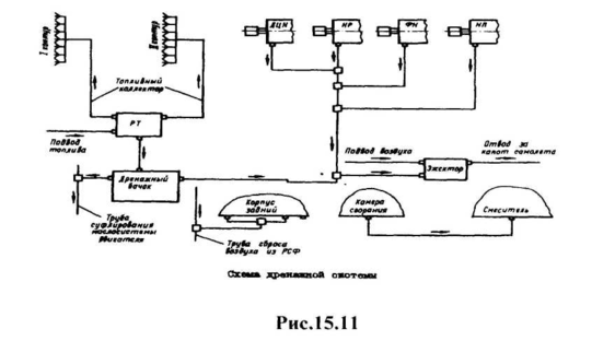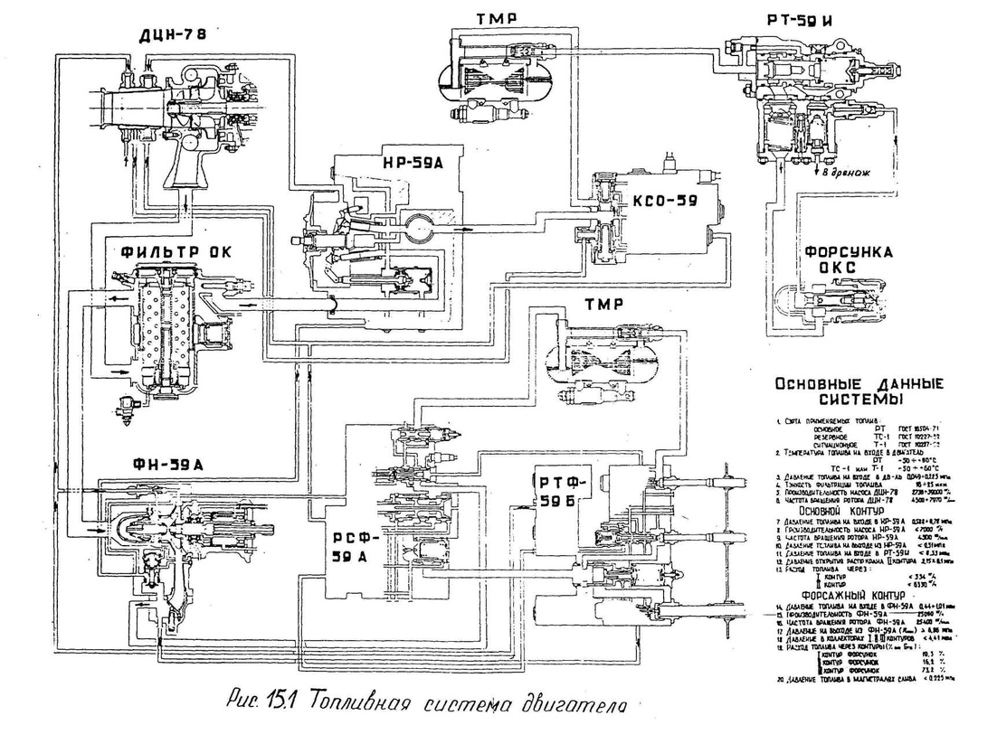 Топливная система форсажного контура предназначена для подачи и дозирования топлива в форсажную камеру и состоит из (Рис. 15.1) агрегата ФН-59А, агрегатов системы автоматического управления и топливных коллекторов с форсунками.