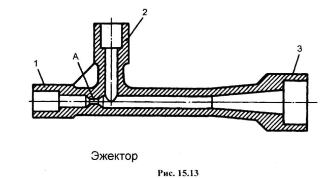 Эжектор предназначен для удаления топлива и масла из дренажных полостей топливных агрегатов и представляет собой (Рис. 15.13) стальную отливку со штуцерами 1,2,3, которые соединены с трубопроводами посредством пайки. Отверстие А служит для увеличения скорости эжектирующего воздуха.