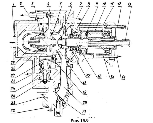Агрегат ФН-59А (рис. 15.9) представляет собой одноступенчатый насос центробежного типа и обеспечивает подачу топлива на форсированных режимах в форсажный контур, а также перепуск топлива от НР-59А для питания агрегатов автоматики форсажного контура на нефорсированных режимах работы двигателя.