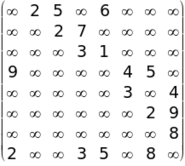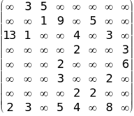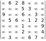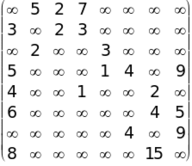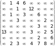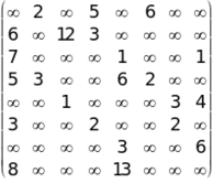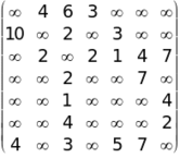 10. Используя алгоритм Форда, найти минимальные пути из первой вершины во все достижимые вершины в нагруженном графе, заданном матрицей длин дуг.
