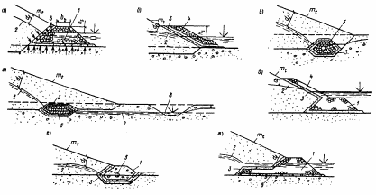 2.58. Комбинированный дренаж (черт. 2, д — ж) представляет собой одну из возможных комбинаций дренажей, указанных в пп. 2.54* — 2.57. Отметку гребня банкета комбинированного дренажа (см. черт. 2, д) следует назначать с учетом условий перекрытия русла реки.