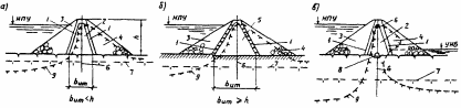 | Каменно-земляная мерзлая | Грунтовое ядро и мерзлотные завесы в ядре и основании (черт. 6.1, а) Центральная грунтовая призма и мерзлотные завесы в призме и основании (черт. 6.1, б) Грунтовое ядро и мерзлотная завеса в ядре и мерзлотная завеса в основании, выполняемая из потерны (черт. 6.1, в) | I |