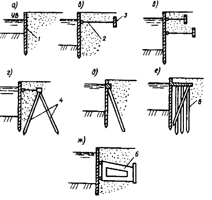 а - безанкерные; б, в, г - заанкеренные одной или двумя тягами к плитам и сваям; д - заанкеренные к наклонным сваям; е - свайный ростверк с передним шпунтом; ж - заанкеренные с жестким (в том числе скользящим) анкерным устройством; 1 - шпунт; 2 - анкерная тяга; 3 - анкерная плита; 4 - анкерные сваи; 5 - свайный фундамент; 6- жесткий анкер