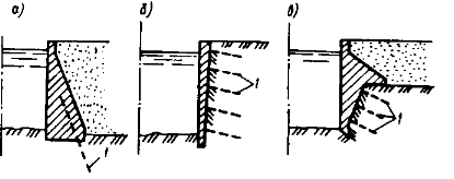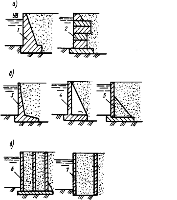 а - массивные; б - уголковые; в - ячеистые; 1 - монолитные; 2 - из сборных элементов; 3 - консольные; 4 - контрфорсные; 5 - с анкерными тягами; 6 - возводимые в котловане или наплавные; 7 - из оболочек большого диаметра