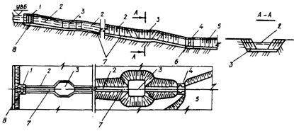 1 - верхняя голова; 2 - камеры тракта; 3 - прудки для отдыха рыб; 4 - входной оголовок; 5 - подходной участок; 6 - пазы ремонтных заграждений; 7 - тракт; 8 - устройство для регулирования расхода