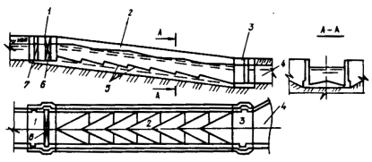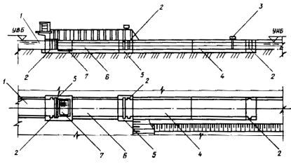 1 - верхняя голова; 2 - тракт; 3 - входной оголовок; 4 - подходной участок; 5 - устройство для гашения скорости воды в тракте; 6 - устройство для регулирования расхода; 7 - пазы ремонтных заграждений