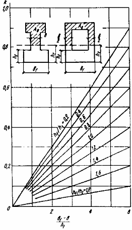 НОМОГРАММА ДЛЯ ОПРЕДЕЛЕНИЯ КОЭФФИЦИЕНТА k ДЛЯ РАСЧЕТА ПРОЧНОСТИ БЕТОННЫХ ЭЛЕМЕНТОВ ТАВРОВОГО, ДВУТАВРОВОГО И КОРОБЧАТОГО СЕЧЕНИЙ