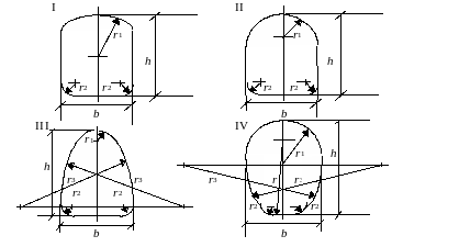 2.6. Поперечное сечение напорных туннелей следует принимать кругового очертания. В устойчивых слаботрещиноватых скальных грунтах допускается принимать некруговое очертание напорного туннеля (см. черт. 1, формы I, II, IV), если при этом удовлетворяются условия прочности обделки.