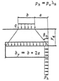 8. При наличии на поверхности грунта в пределах призмы обрушения полосовой равномерно распределенной нагрузки q на ширине b давление от нее следует распределять в стороны пол углами q0 к вертикали (черт. 2) до пересечения с плоскостью подпорной стены на глубине