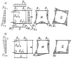 Усилия в стене следует определять как для балки, лежащей на двух опорах, с нагрузками ph1, ph2, реакцией на верхней опоре (распорке) R1 и опорным моментом на нижней споре M1.