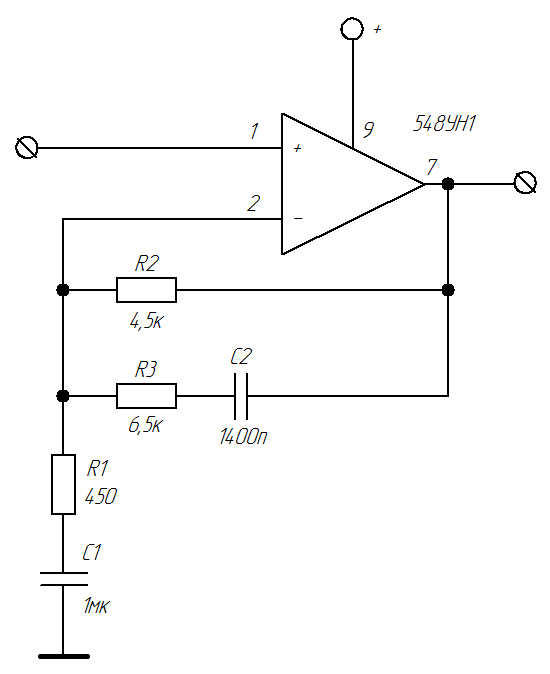 | 2 Анализ исходных данных. 2.1 Описание работы схемы. Усилитель построен на базе микросхемы 548УН1, которая обладает целым рядом преимуществ по сравнению со схемами на отдельных операционных усилителях. Основное преимущество - низкие шумы. На не инвертирующий вход подается сам входной сигнал, а на инвертирующий - выходной сигнал, поделённый резистивным делителем напряжения R1 -R2. Необходимая частотная коррекция в схеме осуществляется при помощи цепочки R1-C1 и R3-C2. 2.2 Электрический расчет схемы. Таблица 1
