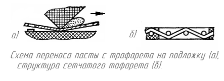 | 4 Разработка технологии изготовления МСБ. 4.1 Изготовление платы. Толстые плёнки толщиной несколько десятков мкм применяют для изготовления пассивных элементов (резисторов, конденсаторов, проводников и контактов) в гибридных толстоплёночных микросхемах, а также проводников и изолирующих слоёв в некоторых типах многоуровневых коммутационных плат. В основе толстоплёночной технологии лежит использование дешёвых и высокопроизводительных процессов, требующих небольших единовременных затрат на подготовку производства, благодаря чему она оказывается экономически целесообразной и в условиях мелкосерийного производства. Высокая надёжность толстоплёночных элементов обусловлена прочным (свыше 50 кгс/см2) сцеплением с керамической подложкой, которое достигается процессом вжигания пасты в поверхностный слой керамики. В целом толстоплёночная технология состоит из ряда последовательных идентичных циклов, структурная схема которых приведена на рис. 4.1. При формировании каждого слоя (резистивного, проводящего, диэлектрического и т.п.) используют соответствующие пасты, которые через сетчатый трафарет наносят на подложку, подвергают сушке и вжиганию. По завершении формирования всех слоёв все резисторы и конденсаторы проходят подгонку (обычно лазерную) до заданной точности. 4.1.1 Трафаретная печать. Трафарет представляет собой проволочную сетку из нержавеющей стали или капроновой нити с нанесенным на нее защитным рисунком. Сетка вмонтирована в металлическую рамку. Керамическая подложка устанавливается под трафаретом с зазором, обеспечивающим деформацию сетки в пределах ее упругости. Для этого размеры сетки должны быть существенно больше размеров рисунка. После нанесения дозированного количества пасты движением ракеля паста продавливается через открытые участки трафарета и переносится на подложку. Таким образом, контакт трафарета с подложкой происходит по линии, движущейся вместе с ракелем. | ||||||