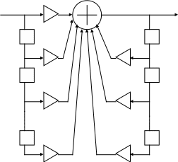 Разумеется, отдельные части схемы можно реализовывать в виде канонических или транспонированных структур (см. подраздел 6.4 ). Так же как и каскадная форма, параллельная обеспечивает меньшую чувствительность частотных и временных характеристик фильтра к точности представления коэффициентов по сравнению с прямой, канонической и транспонированной структурами. Это позволяет при реализации цифрового фильтра в виде специализированного вычислительного устройства обеспечивать заданные допуски на отклонение характеристик от расчётных при меньшем количестве двоичных разрядов, используемых для представления коэффициентов фильтра.