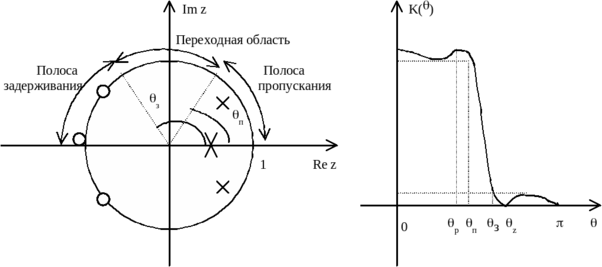 При изменении углового параметра векторы также изменяются, отслеживая положение текущей точки. Изменение модуля вектора даёт вклад данного нуля или полюса в АЧХ ЦФ, а изменение угла между вектором и действительной осью z-плоскости – вклад в ФЧХ ЦФ. Вследствие того что функция exp(j) изменяется периодически и изображающая точка, задающая текущую частоту, скользит по окружности единичного радиуса, возвращаясь в прежние положения, частотные характеристики ЦФ носят периодический характер, повторяясь с интервалом =2 или f=Fs. Для формирования АЧХ нужного вида следует разметить верхнюю полуокружность единичного радиуса на z-плоскости, обозначив полосы пропускания и задерживания. Для этого граничные частоты следует пересчитать в угловые параметры: гр=2fгр/Fs. Полюса нужно располагать в полосе пропускания внутри единичной окружности (для устойчивости фильтра требуется выполнение условия |pk| < 1 для любого k). Чем ближе полюс к окружности, тем более резкий и узкий всплеск АЧХ получится вблизи значения , равного угловому положению полюса arg(pk) (здесь вектор, проведённый от полюса к окружности, самый короткий, а модуль этого вектора стоит в знаменателе выражения для АЧХ). Нули размещают в полосе задерживания. Чем ближе нуль к единичной окружности, тем глубже провал АЧХ при значении , равном угловому положению нуля arg(zk). На рис.2 приведена диаграмма полюсов и нулей ФНЧ с разметкой полос пропускания и задерживания в виде дуг единичной окружности и соответствующая этой диаграмме АЧХ фильтра. Каждому комплексному полюсу или нулю соответствует комплексно-сопряжённый, расположенный в нижней полуплоскости.