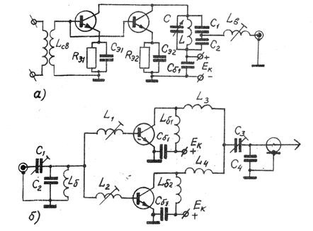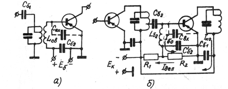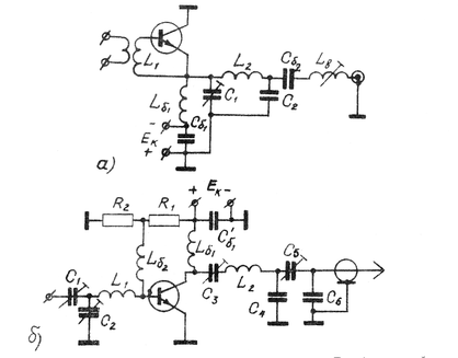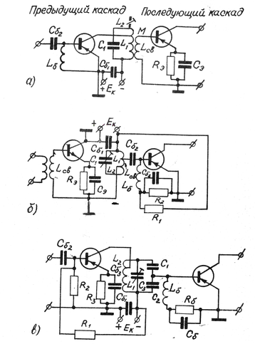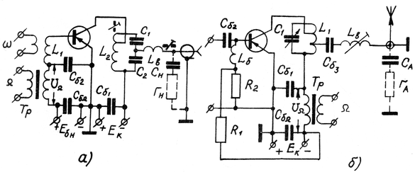 В транзисторных усилительных каскадах, как правило, используется схема с общим эмиттером, которая дает наибольшее усиление по мощности. В автогенераторах используется как схема с общим эмиттером, так и схема с общей базой. При работе автогенератора на частотах f <<f чаще применяется схема с общим эмиттером, а на частотах, близких f , как правило, схема с общей базой.