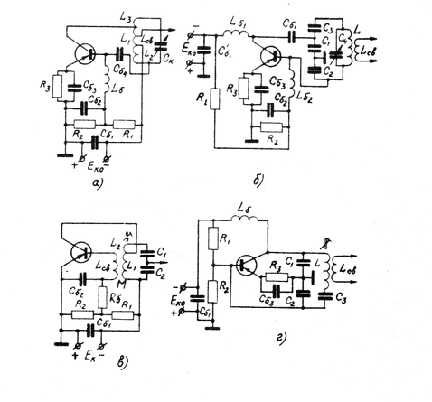 Рис .11.1. Схемы одноконтурных автогенераторов с различными видами обратной связи: а.-с автотрансформаторной; (б, г-с емкостной; в-с трансформаторной .