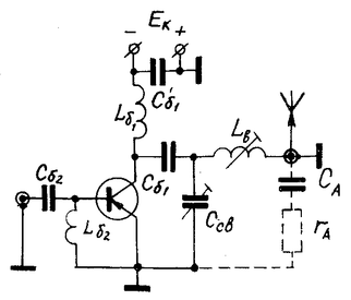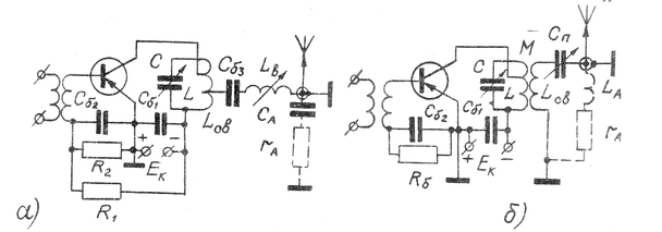 Колебательный контур L7, C10 усилителя настроен на рабочую частоту и не полностью включен в коллекторную цепь. Для осуществления качественной амплитудной модуляции добротность нагруженного коллекторного контура бывает невысокой, поэтому специальной подстройки частоты контура не предусмотрено. Коллекторная колебательная система построена по сложной схеме, состоящей из двух настроенных контуров: промежуточного ( L7, C10) и антенного, образованного катушками (L8, L9) конденсатором C12 и входным сопротивлением антенны Za . Связь между контурами - трансформаторная. Напряжение коллекторного питания транзисторов T3, T4 подводится к средней точке катушки L7 . Модулирующее напряжение подается в цепь коллекторного питания вторичной обмоткой трансформатора Tp2 выходного модуляционного устройства.