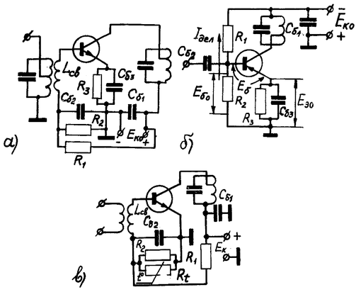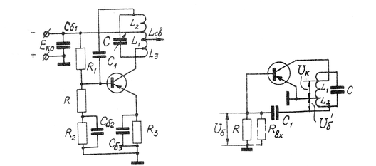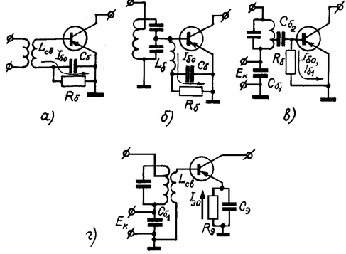 Одноконтурные автогенераторы выполняются по схемам с автотрансформаторной (рис.11.1,а), емкостной (рис.11,1,6,г) и трансформаторной (рис.11.I,в) обратной связью. Характерной особенностью транзисторных автогенераторов является подача комбинированного смещения на базу. Это объясняется тем, что транзисторы имеют "правую" характеристику коллекторного тока iк=fк(Uб)* и для получения режима мягкого самовозбуждения на базу транзистора необходимо подавать начальное отпирающее напряжение смещения Ебнач , при котором крутизна характеристики iк=fк(Uб) в точке покоя достаточна для самовозбуждения.