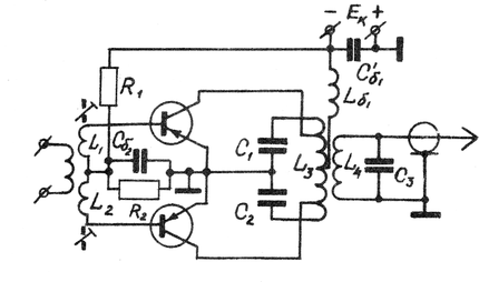 Промежуточный усилитель собран на транзисторе T2 по схеме с общим эмиттером для получения большого усилителя. Колебательный контур усилителя L4, C8 настроен на частоту возбуждения и имеет неполное включение в коллекторную цепь для получения необходимого эквивалентного сопротивления коллекторной нагрузки. Смещение на базе и температурная стабилизация режима транзистора T2 осуществляется резисторами (R6, R7, R8) Связь усилителя с выходным каскадом - трансформаторная. Выходной каскад - мощный усилитель - собран на транзисторах Т3, Т4 по двухтактной схеме для увеличения выходной мощности. Смещение на базе транзисторов - нулевое. Для получения симметричной работы схемы во входной цепи каскада предусмотрена возможность регулировки амплитуды возбуждения каждого из транзисторов путем . изменения индуктивности катушек L5, L6 специальными сердечниками.