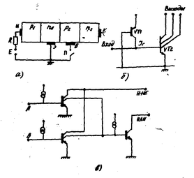 Транзистор с инжекционным питанием представляет собой четырехслойную структуру p1 – n1 – p2 - n2 -типа (рис. 4,а), в которой можно выделить два транзистора n – p – n – и p – n – p –типа. Транзистор p – n – p - типа образован инжекторной p1 - областью, играющей роль эмиттера, частью эмиттерной n1 - области, служащей базой, и базовой p2- областью, выполняющей функции коллектора. Транзистор n – p – n -типа с вертикальным расположением электродов образован частью эмиттерной n1 -области, примыкающей к ней частью базовой p2 -области и коллекторной n2 – областью. Заметим, что в логических элементах данного типа не требуется ни изолирующих областей, ни резисторов, что позволяет достичь высокой плотности интеграции.