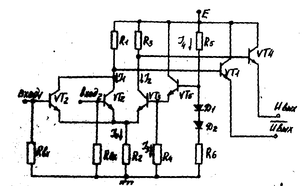 Сигналы с коллекторных нагрузок левой и правой ветвей дифференциального усилителя через эмиттерные повторители поступают на прямой и инверсный выходы схемы. Выходные эмиттерные повторители предназначены для выполнения логических функций (вторая ступень логики), усилении сигнала по мощности, работы на согласованные линии связи, а также для смещения выходных сигналов по напряжению в целях обеспечения совместной работы с другими злементами.
