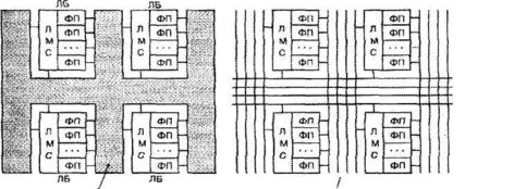 Одноуровневые СБИС содержат простейшие функциональные преобразователи, организованные в виде матрицы или линейки, и единую для всей СБИС матрицу соединений функциональных преобразователей (см. рис. 4.10), разделенную узлами коммутации.