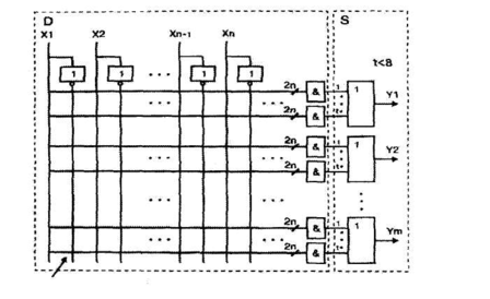 4.3. ПЗУ- универсальный логический преобразователь СБИС ПЛ следующего поколения - программируемые логические матрицы ПЛМ (Programmable Logic Array - PLA), позволяющие реализовать логические функции, представленные в произвольной (сокращенной, тупиковой, минимальной) дизъюнктивной нормальной форме (ДНФ). ПЛМ также, как и ПЗУ, имеет структуру универсального логического преобразователя (см. рис. 4.4); дешифратор (D) - шифратор (S). Причем, и дешифратор (матрица "И") и шифратор (матрица "ИЛИ") являются программируемыми. Для обеспечения возможности реализации не только комбинационных, но и последовательных схем, на выходы шифратора были добавлены триггеры. Такие БИС получили название программируемые
