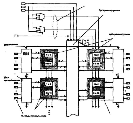 Программируемая матрица соединений обеспечивает возможность передачи сигналов: между Л Б; от блоков ввода/вывода к Л Б; от специализированных входов СБИС к ЛБ и блокам ввода/вывода, и представляет собой набор непрерывных, единых для всей СБИС каналов. Входными сигналами ПМС являются: 16 сигналов обратной связи от каждого Л Б; от 6 до 12 сигналов, поступающих от каждого блока ввода/вывода; 4 сигнала со специализированных входов СБИС. Общее число каналов ПМС, таким образом, составляет: jVr= 4+n*16+n*6(12). где