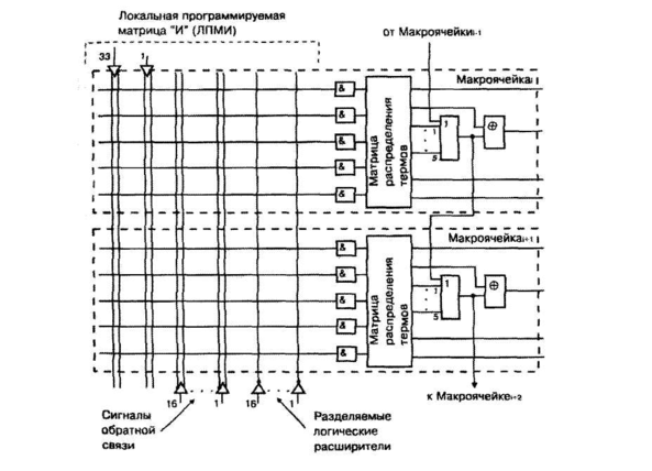 Для реализации сложных логических функций с большим количеством переменных, целесообразно использование разделяемых логических расширителей. Разделяемый логический расширитель формирует терм, инверсное значение которого передается матрицей размещения термов в локальную программируемую матрицу "И" и может быть использовано в любой макроячейке данного ЛБ.