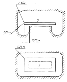 S - поверхность, на которой может находится человек; 0,75; 1,25; 2,50 м - расстояния от края поверхности S до границы зоны досягаемости