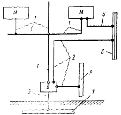 1 — защитный проводник; 2 — главный проводник системы уравнивания потенциалов; 3 — заземляющий проводник; 4 — дополнительный проводник системы уравнивания потенциалов; В — главный зажим (болт) заземления; М — заземляемая часть электрооборудования (открытая проводящая часть); С — металлоконструкция здания (сторонняя проводящая часть); Р — металлический стояк (труба) водопровода; Т — заземлитель