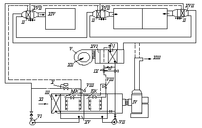 I, II, III – теплообменники (воздухоохладители); МК – оросительная камера малого контура циркуляции; БК – оросительная камера большого контура циркуляции; IV, V – соответственно вентиляторы испарительного и приточного кондиционеров; VI, VII – соответственно циркуляционные насосы малого и большого контуров циркуляции; VIII – соленоидные клапаны; IX – взаимообратные клапаны; Х – регуляторы давления; XI – наружный или рециркуляционный воздух; XII – наружный воздух (в теплый период года); XIII – выброс в атмосферу; XIV – приток в обслуживаемые помещения; XV – испарительный кондиционер; XVI – приточный кондиционер; XVII – калорифер;
