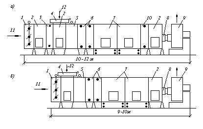 а – для схемы бескомпрессорной системы кондиционирования воздуха, приведенной на рис. 1; б – для схемы бескомпрессорной системы кондиционирования воздуха, приведенной на рис. 2; 1 – приемный клапан; 2 – камера обслуживания; 3 – теплообменник первого подогрева; 4 – клапан воздушный; 5 – фильтр; 6 – теплообменники (воздухоохладители); 7 – камеры оросительные; 8 – секция присоединительная к вентилятору; 9 – вентиляторный агрегат; 10 – теплообменник второго подогрева; 11 – наружный воздух; 12 – рециркуляционный воздух