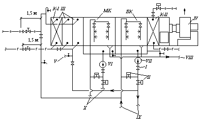 I – обратный клапан; II – взаимообратные клапаны; III – теплообменник (воздухоохладитель); К-I – теплообменник первого подогрева (элемент теплообменника III); МК – оросительная камера малого контура циркуляции; БК – оросительная камера большого контура циркуляции; К-II – теплообменник второго подогрева; IV – вентилятор испарительного кондиционера; V – спуск воды в канализацию; VI, VII – соответственно циркуляционные насосы малого и большого контура циркуляции; VIII – канализационная линия; IX – трубопроводы к теплообменнику I приточного кондиционера; Х – трубопроводы к теплообменнику II приточного кондиционера; -г-г- горячая магистраль; -о-о- обратная магистраль