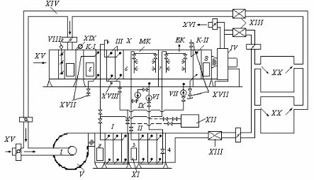 1, 2, 3, 4 – состояние воздуха при его обработке в приточном кондиционере; 5, 6, 7, 8 – состояние воздуха при его обработке в испарительном кондиционере; I, II, III – теплообменники (воздухоохладители); К-I, K-II – соответственно теплообменники первого и второго подогрева; МК – оросительная камера малого контура циркуляции; БК – оросительная камера большого контура циркуляции; IV, V – соответственно вентиляторы испарительного и приточного кондиционеров; VI, VII – соответственно циркуляционные насосы малого и большого контуров циркуляции; VIII – воздушные заслонки; IX – насос для адиабатического увлажнения воздуха; X – испарительный кондиционер; XI – приточный кондиционер; XII – бак-аккумулятор; XIII – шумоглушитель; XIV – вытяжной или рециркуляционный воздух; XV – наружный воздух; XVI – выброс в атмосферу; XVII – места присоединения к трубопроводам ТЭЦ; XVIII – кран для спуска воды из теплообменников; XIX – фильтр; XX – обслуживаемые помещения