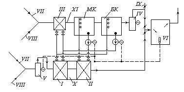 I, II, III – теплообменники (воздухоохладители); IV, V – соответственно вентиляторы испарительного и приточного кондиционеров; VI – датчик температуры воздуха в помещении; МК, БК – соответственно оросительные камеры малого и большого контуров циркуляции; VII – наружный воздух; VIII – рециркуляционный воздух; IX – выброс в атмосферу воздуха в теплый период года; Х – приточный кондиционер; XI – испарительный кондиционер