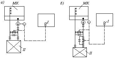 а – схема с клапаном на перемычке; б – схема с двумя взаимообратными клапанами; МК – оросительная камера малого контура циркуляции воды; I – датчик температур воздуха в помещении; II – теплообменник (воздухоохладитель)