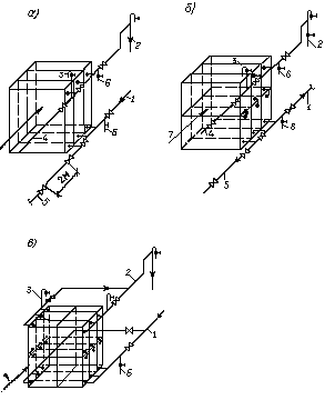 Следует предусматривать параллельное присоединение теплообменников по холодоносителю при общем противоточном движении теплообменивающихся сред. Принципиальные схемы компоновки теплообменников I, II и III, схемы их обвязки приведены на рис. 6.