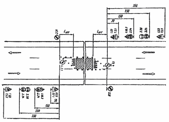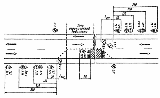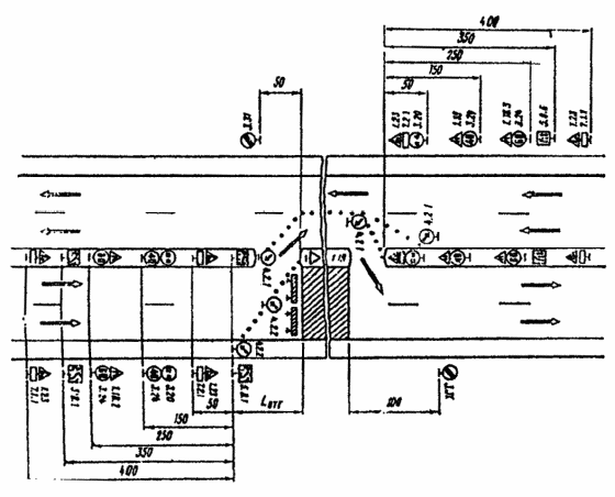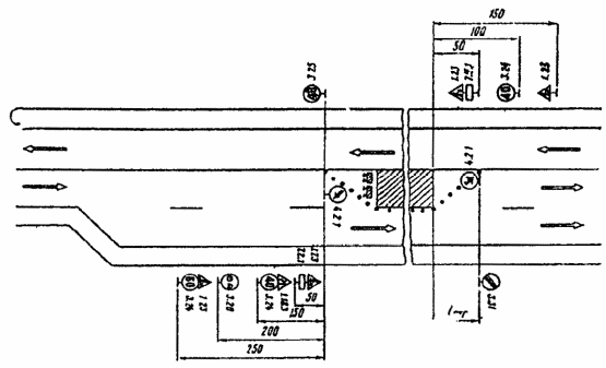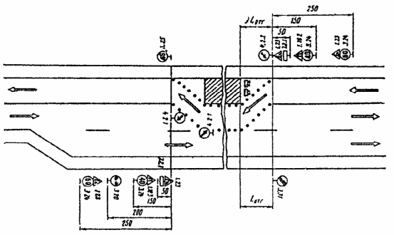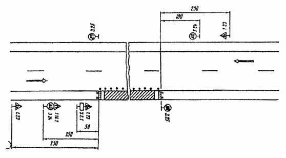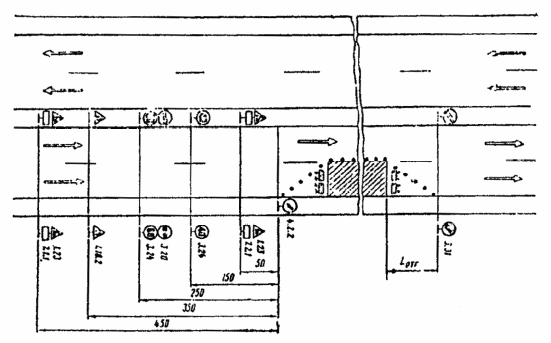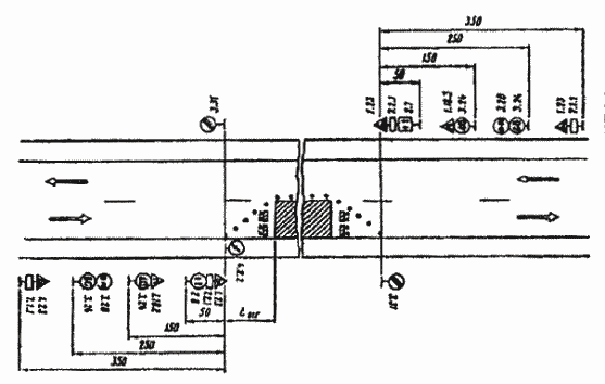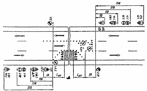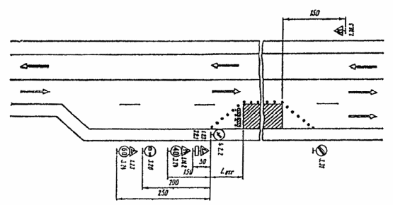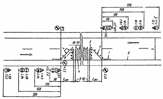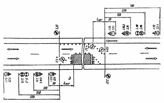 При выполнении дорожных работ на разделительной полосе многополосной дороги расстановку дорожных знаков следует выполнить в соответствии с рис. 3.7.