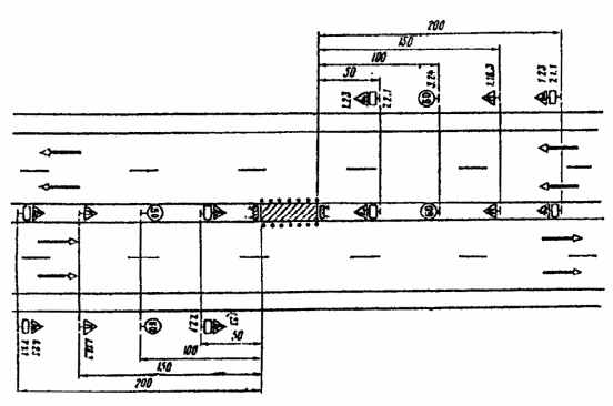 Рис. 2.1. Пример размещения технических средств организации движения в местах производства дорожных работ: