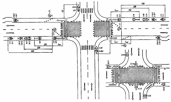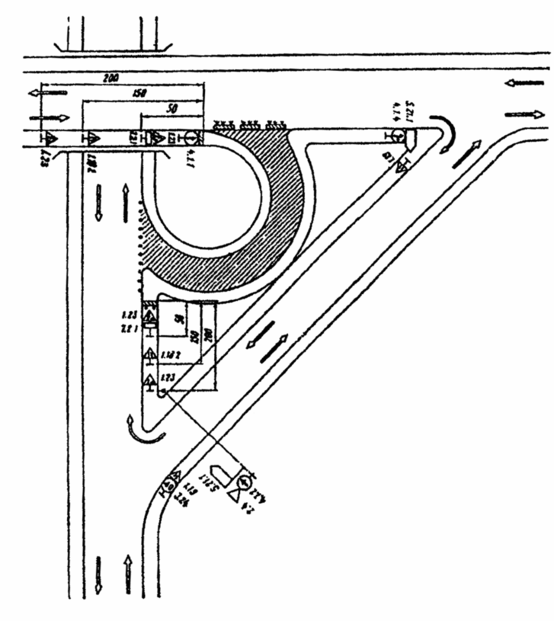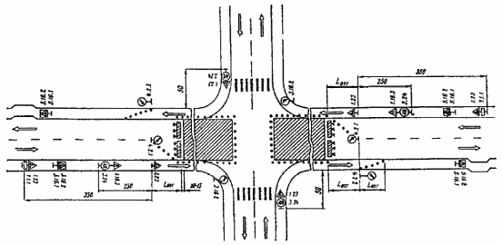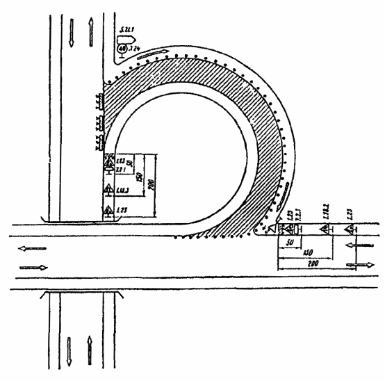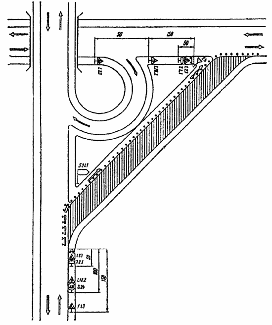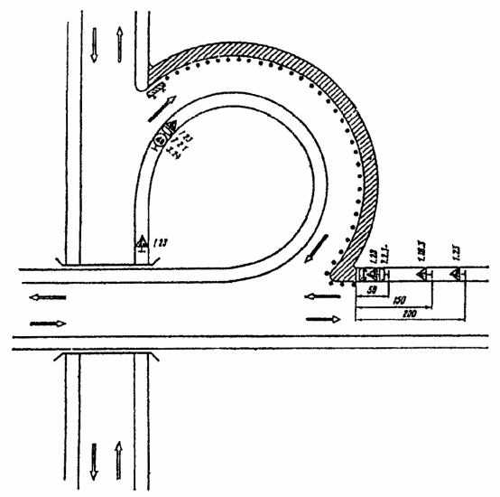 3.19. Схема организации движения с устройством разворота на одной из дорог допустима только при интенсивности движения по главному направлению до 300 авт./ч вследствие возникающих при данной схеме помех транспортным средствам прямого направления.