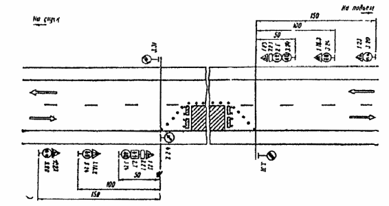 1 - пропуск транспорта в объезд ремонтируемого участка по обочинам главной дороги