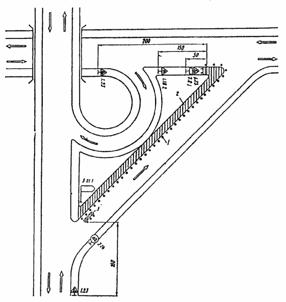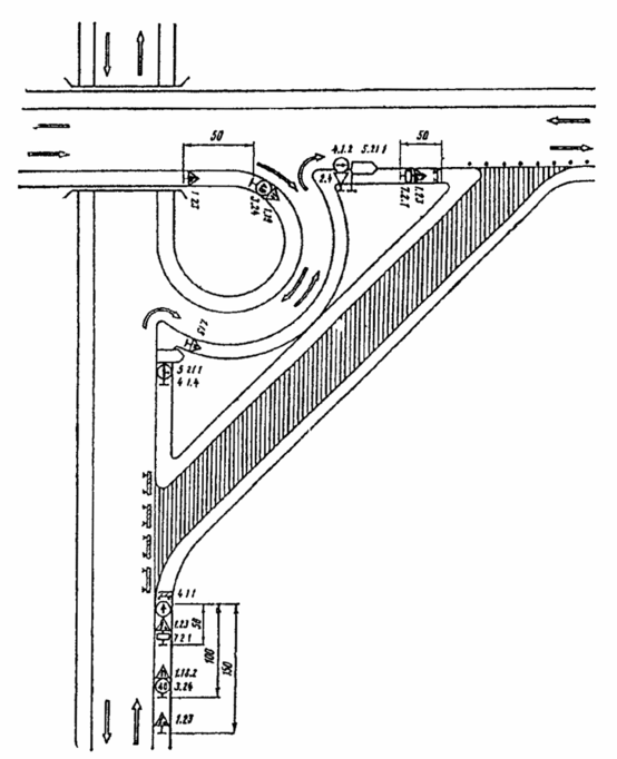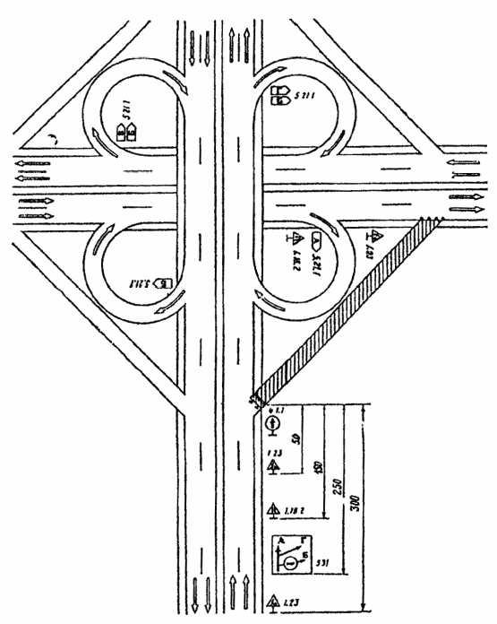 Рис. 3.24. Организация движения и ограждение места дорожных работ при закрытии правоповоротного съезда пересечения в разных уровнях с последовательным проездом трех левоповоротных съездов