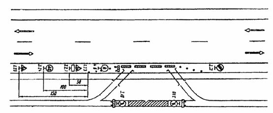 Рис. 3.22. Организация движения и ограждение места дорожных работ, выполняемых на всей ширине проезжей части левоповоротного съезда пересечения в разных уровнях