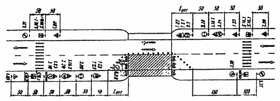 Рис. 3.14. Организация движения и ограждение мест дорожных работ, выполняемых на обочинах пересечения в одном уровне: